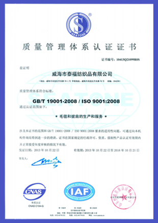 我公司先后順利通過ITS人權(quán)和產(chǎn)能評估,獲得國際羊毛局WOOLMARK標志的使用權(quán)。產(chǎn)品也通過了歐洲SGS檢測。 視產(chǎn)品質(zhì)量為企業(yè)生命,把客戶要求作為我們的工作目標,公司總經(jīng)理王喜成先生愿與國內(nèi)外客商密切合作,共求發(fā)展。
